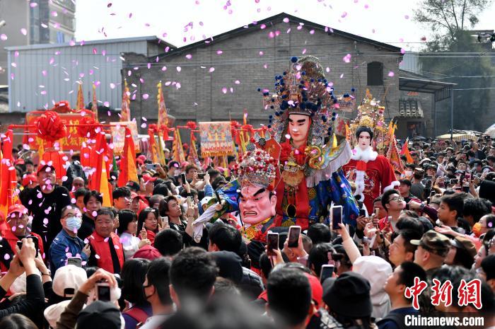 中新網(wǎng)福州2月19日電 (葉秋云)“咚咚咚……”19日上午,一陣陣鑼鼓聲從僑鄉(xiāng)福建省福州市長樂區(qū)潭頭鎮(zhèn)厚福村傳出,一場傳統(tǒng)游神民俗活動在此舉行,來自海內(nèi)外的游客紛紛舉起手機和相機拍照留影。