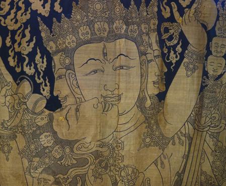 有學(xué)者推測這些唐卡極有可能是在1408年受封為大寶法王的五世噶瑪巴德銀協(xié)巴(1384-1415)返藏之時,或者是1413年、1419年和1423年永樂皇帝派遣使臣賞賜西藏僧俗首領(lǐng)而隨之到達(dá)西藏的。從國內(nèi)的收藏地來看,還有大昭寺、布達(dá)拉宮、瓊果杰寺等與格魯派有關(guān)的寺院,這似乎又意味著受禮者也有可能還包括受封為大慈法王的格魯派高僧釋迦也失(1354-1435)。
