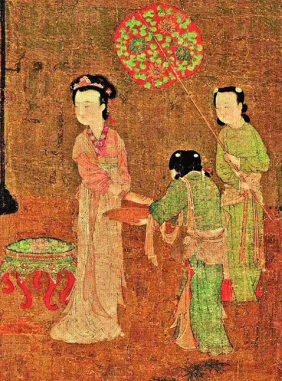宋代女性服飾重神韻。宋代女性清秀也好,婉約也罷,臉部神態(tài)往往離不開妝容。于眉目之間,便有“都緣自有離恨,故畫作遠(yuǎn)山長(zhǎng)”“倒暈工夫,畫得宮眉巧”;于臉頰之間,便有“嫩臉修蛾,淡勻輕掃”“淺拂胭脂輕傅粉”之淡妝,亦有“近來(lái)因甚要濃妝,不管滿城桃杏妒”之濃妝;而于神情之間,便有“和羞走,倚門回首,卻把青梅嗅”“畫愁眉,遮語(yǔ)回輕扇,含羞下繡幃”。從妝容到神態(tài),刻畫了宋代女性神韻一隅。(徐雅琴)