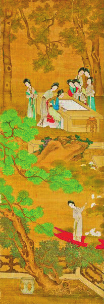 宋代畫作亦呈現(xiàn)女性服飾之濃郁色韻。畫作《女孝經(jīng)》中的女性穿著,有淡綠衫配淡紫裙、白衫配淡綠壓花裙、淡藍(lán)衫配淡黃裙等,披帛外搭相應(yīng)為淡藍(lán)、淡紫和淡黃,女性服色呈現(xiàn)出素淡搭配之主流?!冬幣_(tái)步月圖》為宋代畫家劉宗古創(chuàng)作,畫中女子裙子均為白色,衣著素淡簡(jiǎn)樸,氣質(zhì)高雅脫俗?!额率钟^花圖》中服色搭配更為柔和,女主人上穿淡紫窄袖長(zhǎng)襦,下穿白色長(zhǎng)裙,外搭淡黃披帛;侍女穿淡綠袍衫搭淡黃腰間寬巾,亦有穿淡藍(lán)袍衫搭白色腰圍。《清明上河圖》為中國(guó)古代著名繪畫,由畫家張擇端創(chuàng)作,畫中少有女性,普通勞動(dòng)?jì)D女多穿青色裙或腰系青花圍巾,有身份的女子戴蓋頭、穿紫色褙子,展現(xiàn)出簡(jiǎn)約、素雅的宋代服飾風(fēng)格。
