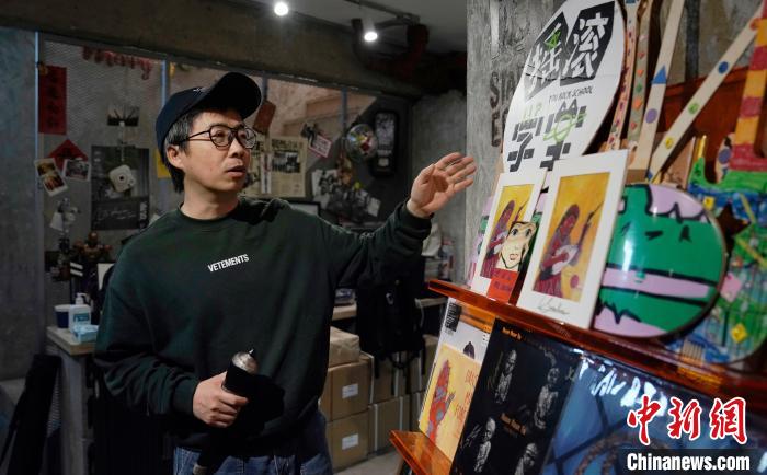 “戰(zhàn)馬時代”創(chuàng)始人、資深樂評人劉釗正在展示為維吾爾族歌唱家塞努拜爾制作的演出周邊紀(jì)念品。景詩雁 攝