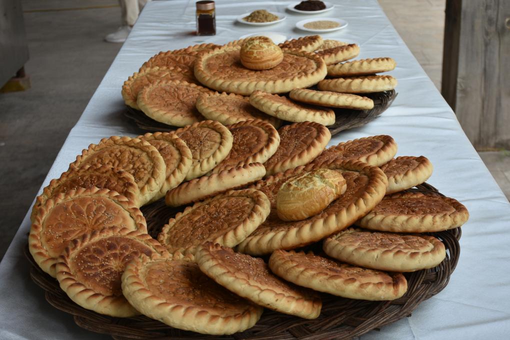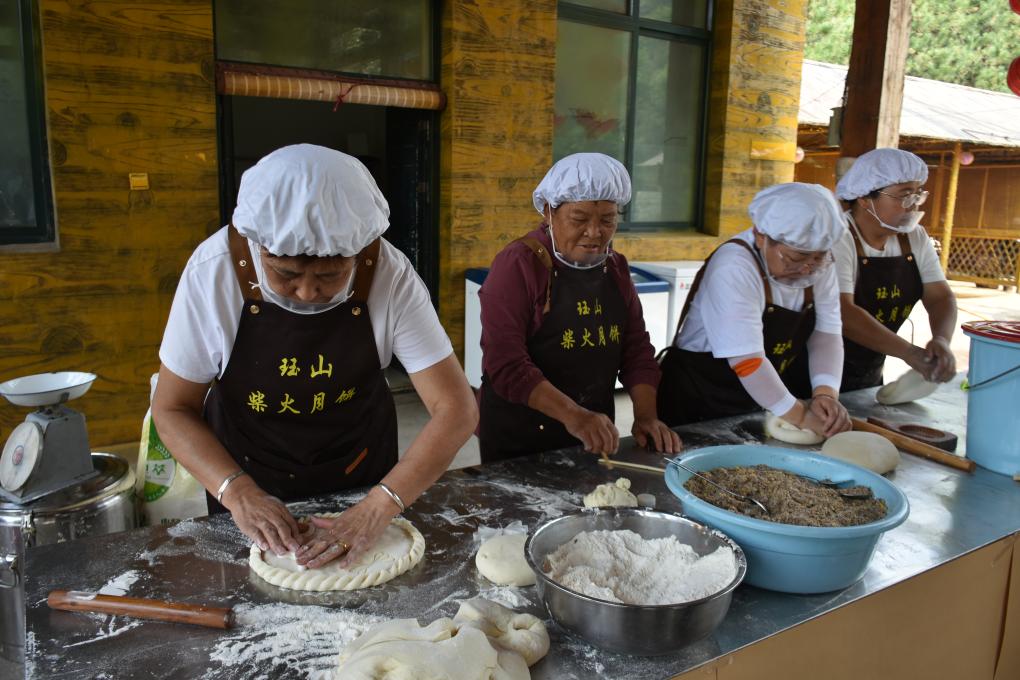 張小女制作的“大團(tuán)圓”月餅體現(xiàn)了當(dāng)?shù)靥厣芍荽衷嘛灴瓷先ハ褚粋€鎖著花邊的圓形面餅,內(nèi)包兩層冰糖、花生、葡萄干、核桃仁等雜碎餡料,表面裝飾圖案,或蒸或烤而成。講究的圖案比較復(fù)雜,但張小女喜歡在村口拔棵野草,洗干凈后,印在上面,充滿野趣。