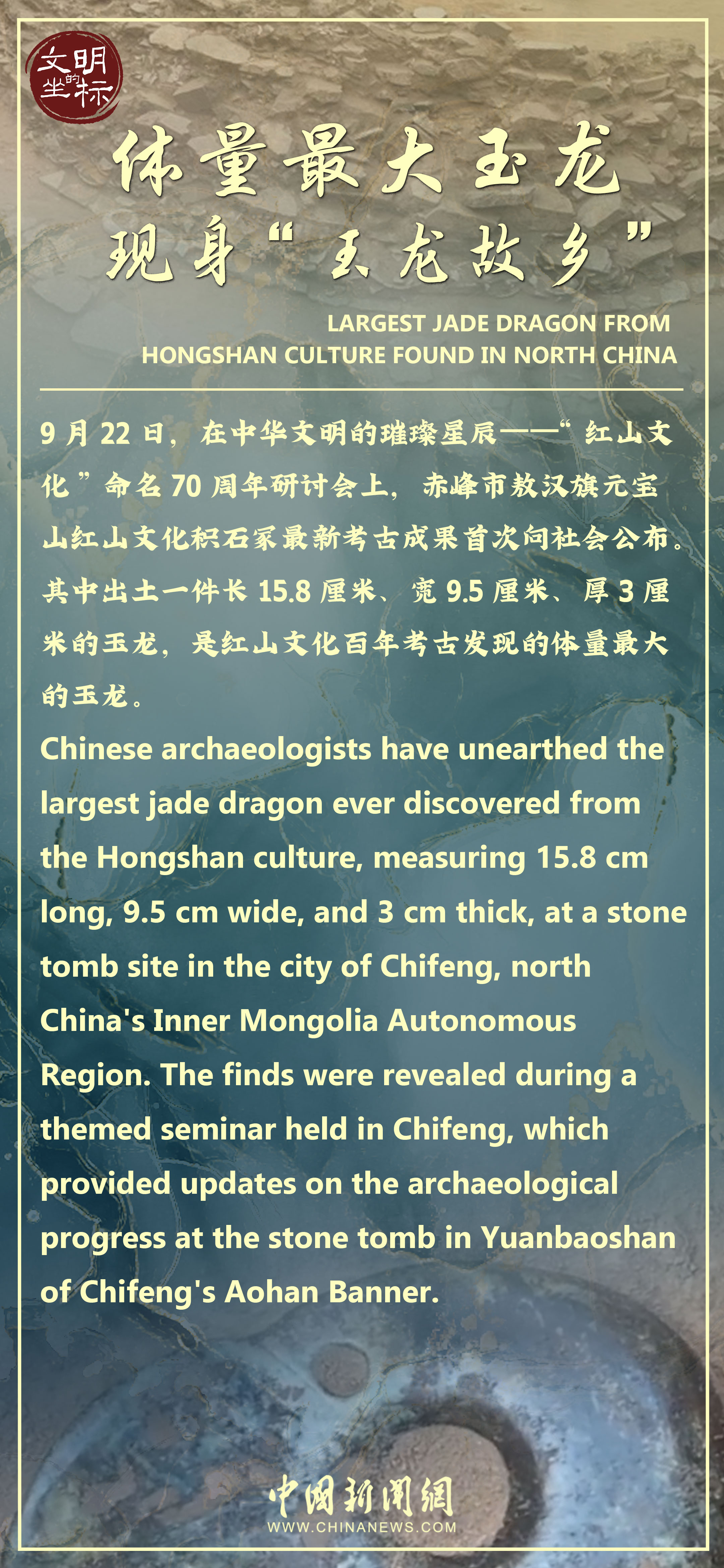 紅山文化因內(nèi)蒙古赤峰市紅山后遺址的發(fā)現(xiàn)、發(fā)掘而得名,至今已有70年。近日,紅山文化考古再一次“上新”。9月22日,赤峰市敖漢旗元寶山紅山文化積石冢最新考古成果首次向社會公布,其中出土的一件長15.8厘米、寬9.5厘米、厚3厘米的玉龍,是紅山文化百年考古發(fā)現(xiàn)的體量最大的玉龍。“龍”,中國人最親切的身份認(rèn)同,也是紅山文化最突出的元素之一。早在1971年,被考古界譽(yù)為紅山文化象征的“中華第一龍”——紅山碧玉龍?jiān)诔喾迨屑t山文化遺址出土,赤峰市也因此被譽(yù)為“中華玉龍之鄉(xiāng)”。來“玉龍故鄉(xiāng)”,探尋中華文明的古老根脈。