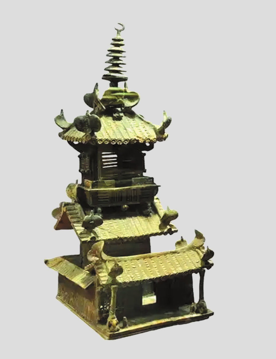 樓閣式塔是樓閣上增加塔剎而形成的。湖北省襄樊市(今湖北省襄陽市)樊城一座墓葬曾出土過樓閣式佛塔模型,通高104厘米,有兩層,屋頂有7層相輪,塔剎頂端有仰月。1986年,四川省博物館的工作人員采集到一塊漢代畫像磚,上面也有清晰的樓閣式塔圖案。樓閣和樓閣式塔不同,樓閣式塔必須具備佛塔的標志——塔剎。塔剎的基本形式是覆缽式塔的縮小版,也就是說將印度形體巨大的覆缽式塔,微縮之后放置于中國傳統(tǒng)的樓閣頂上,就形成了樓閣式塔。