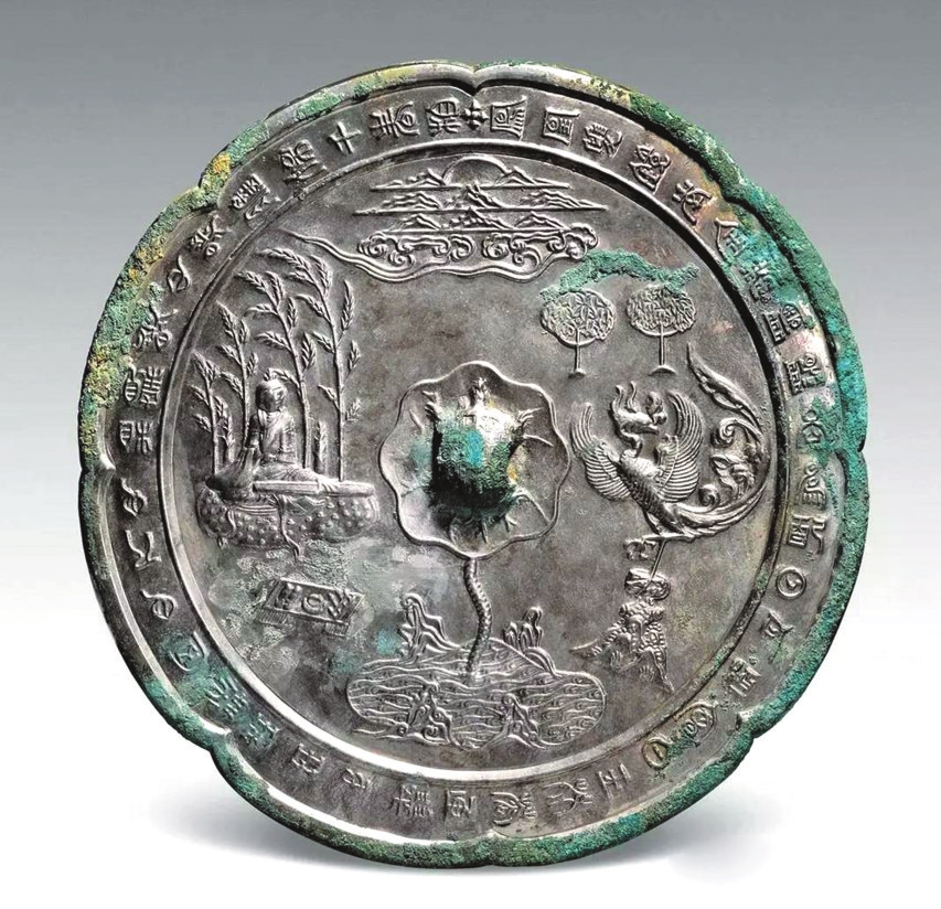 真子飛霜鏡一般都是圓形、葵花形,而西安出土的一面鏡形十分罕見,為亞字形。鏡背上方云海托月,半個(gè)月亮浮上來。真子飛霜鏡的形制,多在細(xì)節(jié)上略有差異。除了鏡鈕上方有“真子飛霜”四字,或者有一只飛翔的仙鶴之外,還有一種在鏡緣飾篆書體銘文,鏡銘為:“鳳凰雙鏡南金裝。陰陽各為配,日月恒相會(huì)。白玉芙蓉匣,翠羽瓊瑤帶。同心人,心相親,照心照膽保千春?!?/p>