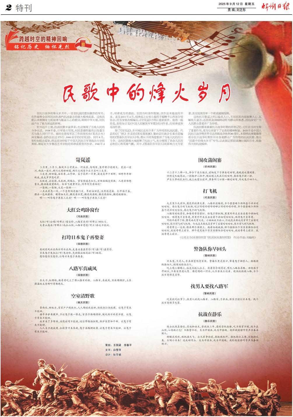 抗戰(zhàn)民歌承載著抗日戰(zhàn)爭時期的珍貴記憶,它們在當(dāng)時發(fā)揮了重要作用,更為后世留下了寶貴的精神財富。2025年是中國人民抗日戰(zhàn)爭暨世界反法西斯戰(zhàn)爭勝利80周年,本報特此搜集整理部分抗日戰(zhàn)爭時期忻州市各地群眾廣為傳唱的抗戰(zhàn)民歌,推出“民歌中的烽火歲月”???,以此銘記那段波瀾壯闊的歷史,致敬偉大的抗戰(zhàn)精神。