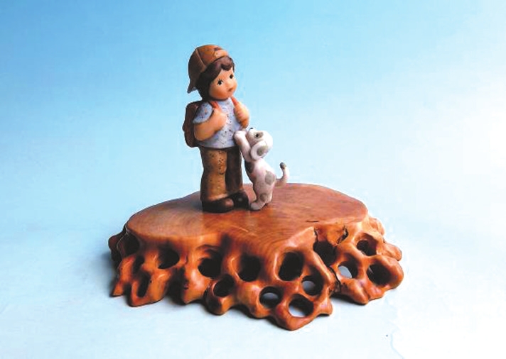 我的藏品中有一件來(lái)自德國(guó)的喜姆瓷偶·上學(xué),它是赴德工作的同事帶回的禮物。這件瓷偶高8.5厘米、長(zhǎng)5.5厘米、寬2.8厘米,生動(dòng)刻畫(huà)了一個(gè)背著雙肩包即將去學(xué)校的小男孩和一只不舍小主人離開(kāi)的花狗,溫馨逗趣的畫(huà)面讓人忍俊不禁。
