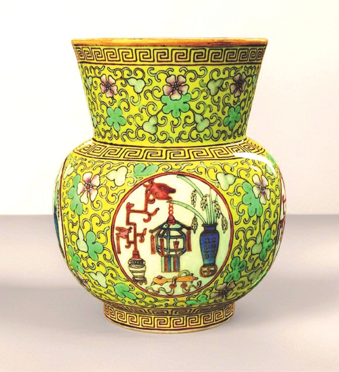 故宮博物院收藏的清代粉彩葫蘆萬代五谷豐登紋渣斗,內壁繪粉彩纏枝葫蘆紋,藤蔓相連,花果繁茂,寓意“子孫綿延”“多子多?!保煌獗邳S地亦繪相同葫蘆紋,設四處圓形開光,內有宮燈、花瓶、如意、稻穗等,寓意“平安如意”“五谷豐登”。開光內花瓶飾“囍”字,表明為皇帝大婚用瓷,既祈子嗣繁衍,又添喜慶吉祥。整器色彩明艷,紋飾繁密華麗,盡顯清代晚期宮廷裝飾的典型風格。