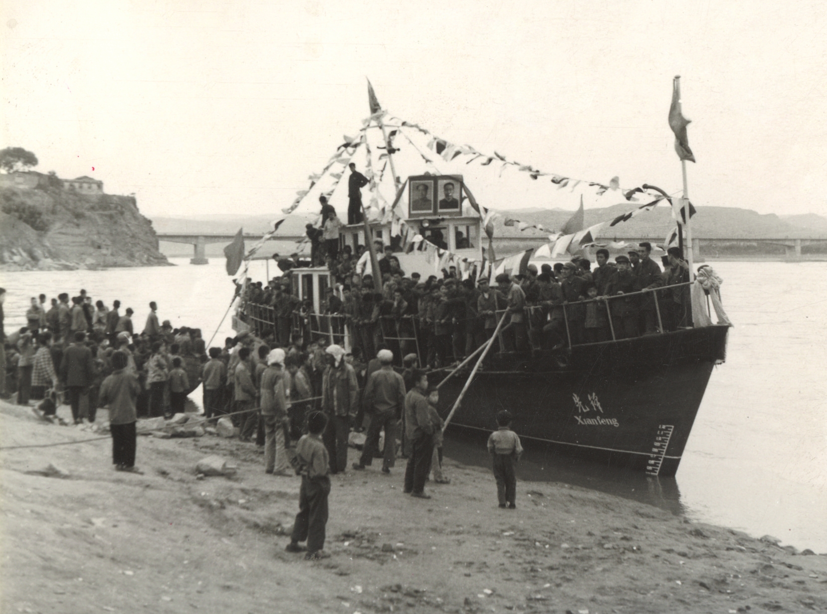 保德縣的木船造得快,取名“先鋒號(hào)”,于1977年5月23日,農(nóng)歷四月初六正式下水。這是晉陜峽谷有史以來第一艘機(jī)動(dòng)船,千年未有之新鮮事,少不了要隆重慶賀。有老照片記錄當(dāng)年盛況:黃河水流浩大,“先鋒號(hào)”泊于岸邊,駕駛艙頂上并排矗立著偉人的大幅畫像,上用紅綢花裝飾,船頭船尾紅旗招展,四條彩帶從駕駛艙頂端連向船沿??h領(lǐng)導(dǎo)排坐于船上,禮儀小姐扯著紅綢,河岸上站滿了看熱鬧的群眾。河風(fēng)吹動(dòng)大小旗幟,機(jī)船顯得威風(fēng)凜凜。
