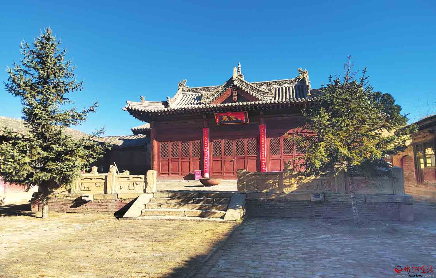 一進(jìn)院布局,中軸線現(xiàn)存有正殿1棟,兩側(cè)建有配殿,西北角建有偏殿。正殿磚砌臺基,面寬五間,進(jìn)深六椽,七檁前后廊式構(gòu)架,前檐斗拱為五踩,后檐為三踩斗拱,單檐懸山頂。前設(shè)月臺,建有抱廈三間,單檐歇山頂?,F(xiàn)新塑像3尊,正殿梁架有彩繪。