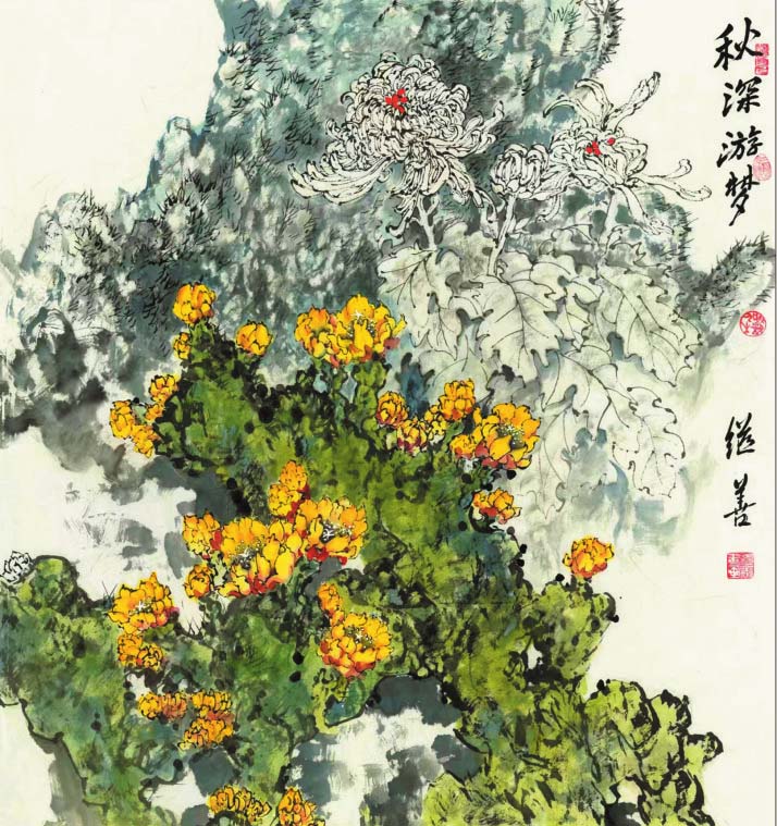 郜繼善的重彩花鳥畫偏傳統(tǒng),筆法細(xì)膩工整,色彩明麗典雅,構(gòu)圖大氣別致,情趣盎然,意境深遠(yuǎn)。作品中各種元素有機(jī)融合,自然穿插,形成和諧有序的布局,讓人既能感受到自然界的豐富與絢爛,又可體味藝術(shù)帶來的愉悅和感動(dòng)。在他的筆下,重彩成為了最具藝術(shù)感染力的手段,也是最有個(gè)性藝術(shù)特征的語言,鮮明、強(qiáng)烈,可謂“脫盡媚俗寫重彩”。
