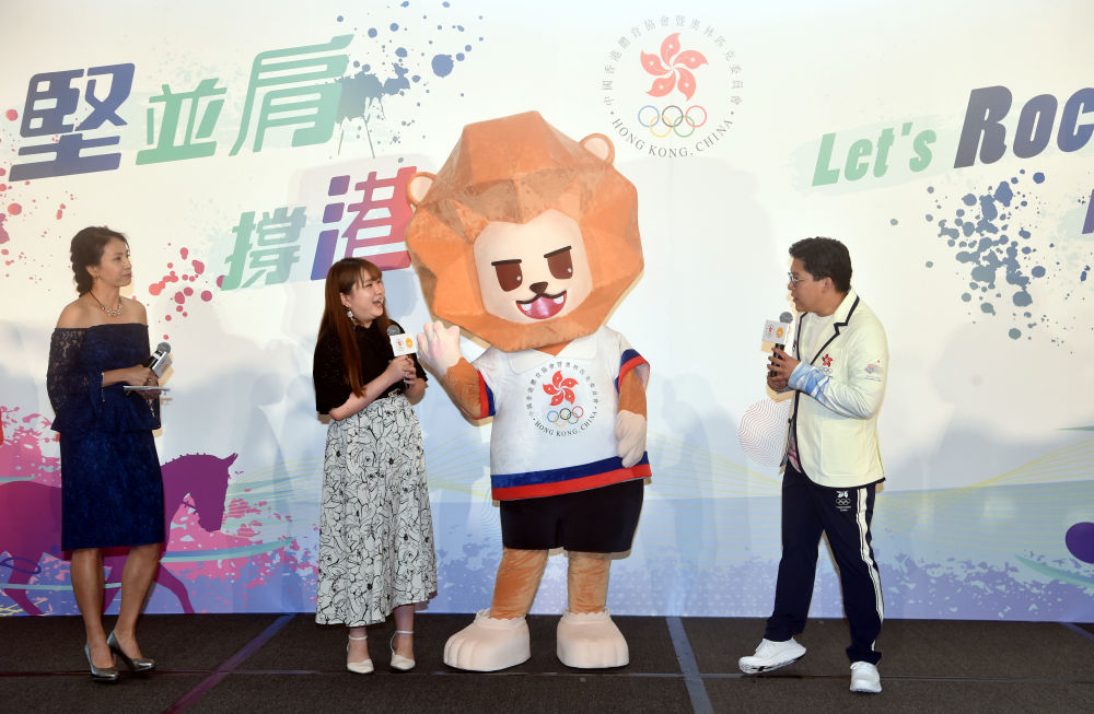6月15日,中國香港代表團吉祥物“堅仔”(右二)亮相。新華社記者盧炳輝攝