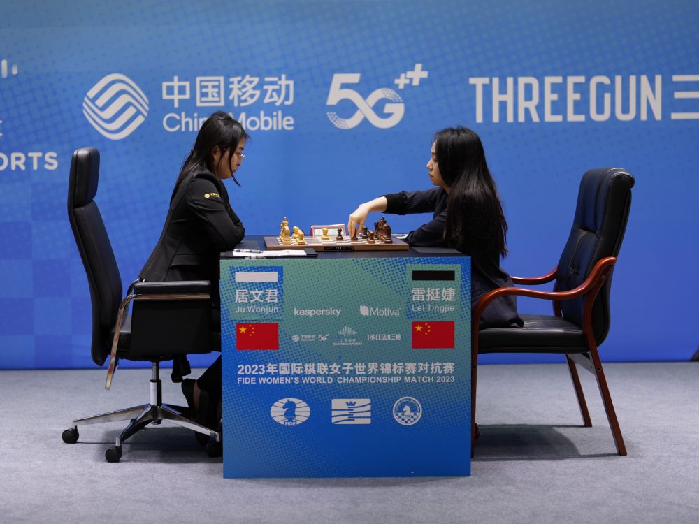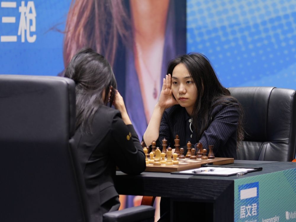 當(dāng)日的比賽居文君執(zhí)白先行采用后翼?xiàng)壉_局,雷挺婕以雙馬防御。隨后挑戰(zhàn)者選擇主動(dòng)出擊,雙方進(jìn)行了激烈爭(zhēng)奪,居文君一度在后翼與中心承受不小壓力,但她防守精確,滴水不漏,也耗去雷挺婕不少時(shí)間。二人隨后進(jìn)行了一系列子力交換,轉(zhuǎn)入大致均勢(shì)的車象兵殘局,最終至第40回合雙方形成三次重復(fù)局面和棋。