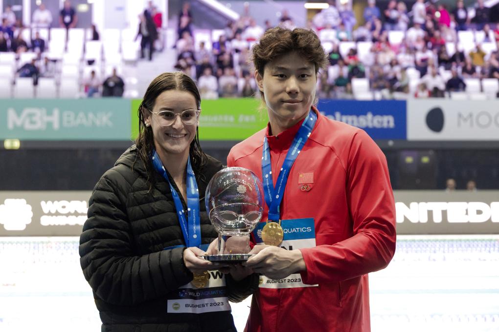 10月22日,覃海洋(右)和麥基翁獲得世界泳聯(lián)世界杯年度總冠軍。當(dāng)日,2023年世界泳聯(lián)游泳世界杯布達佩斯站落幕。新華社發(fā)(弗爾季·奧蒂洛攝)