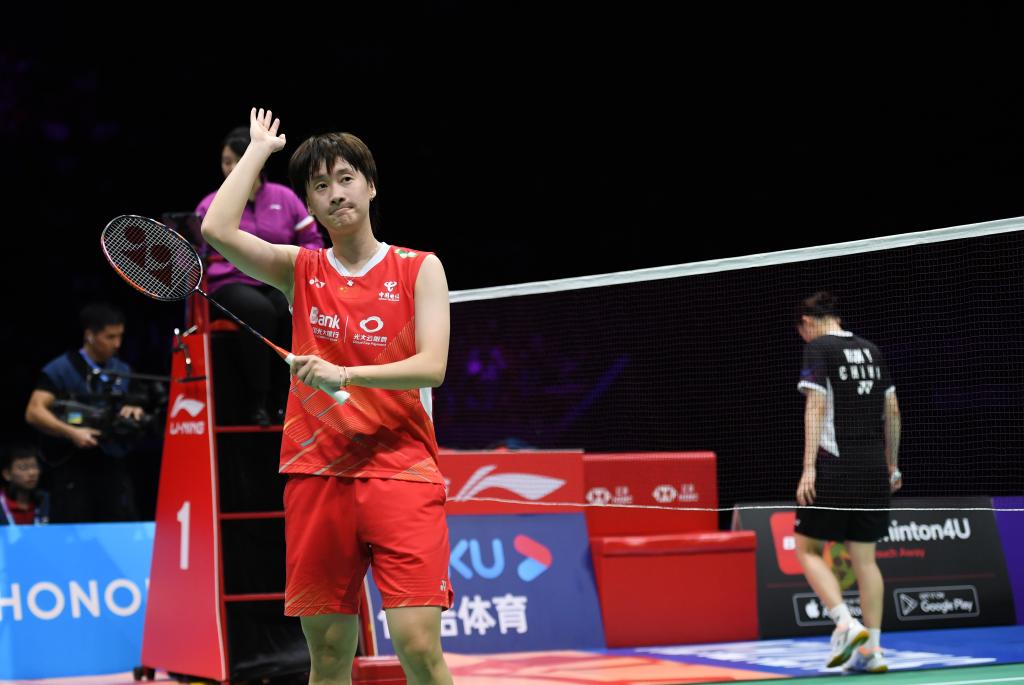 11月26日,陳雨菲(左)在中國(guó)羽毛球大師賽女子單打決賽中獲勝后慶祝。新華社記者 毛思倩 攝