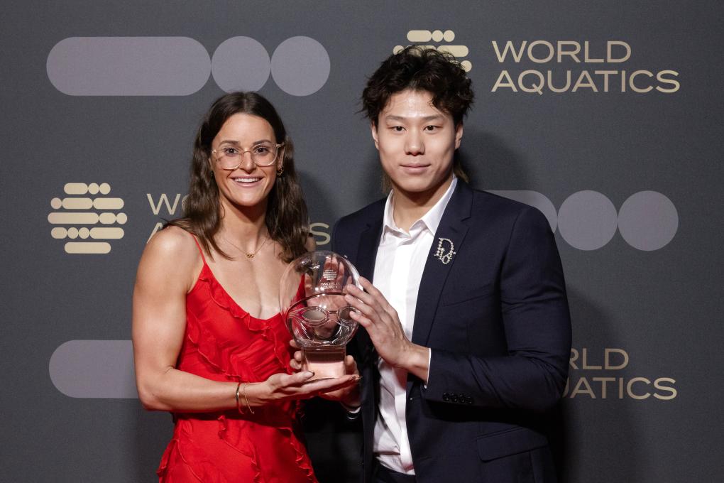 10月23日,在匈牙利布達佩斯,中國選手覃海洋獲選世界泳聯(lián)年度最佳男子游泳運動員,澳大利亞選手麥基翁獲選最佳女子游泳運動員。新華社發(fā)(弗爾季·奧蒂洛攝)