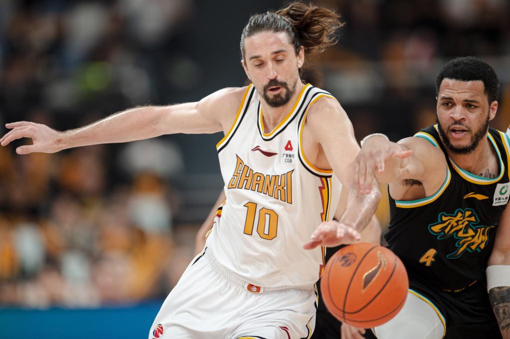 4月10日,廣廈隊(duì)球員韋瑟斯龐(右)防守山西隊(duì)球員施韋德。新華社記者 江漢 攝