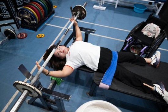 5月20日,女子殘疾人舉重運動員郭玲玲在訓(xùn)練中。新華社記者 才揚 攝
