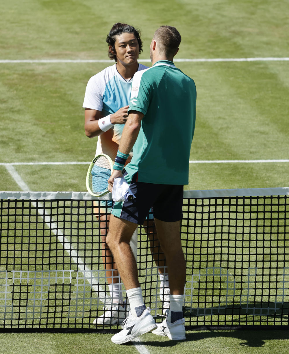 2023年6月13日,張之臻(左)在比賽后與斯特魯夫致意。當日,在德國斯圖加特網(wǎng)球公開賽男子單打首輪比賽中,中國選手張之臻以0比2不敵德國選手斯特魯夫,無緣第二輪。新華社發(fā)(菲利普·魯伊茲 攝)