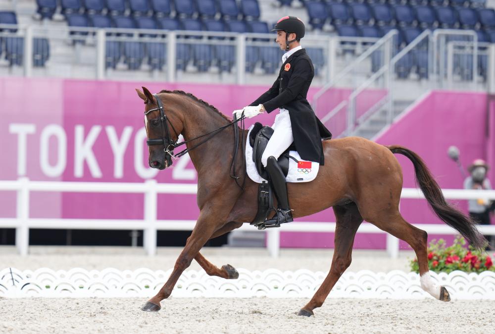 2021年7月30日,中國選手孫華東在東京奧運會馬術(shù)三項賽盛裝舞步首日比賽中。新華社記者 朱崢 攝