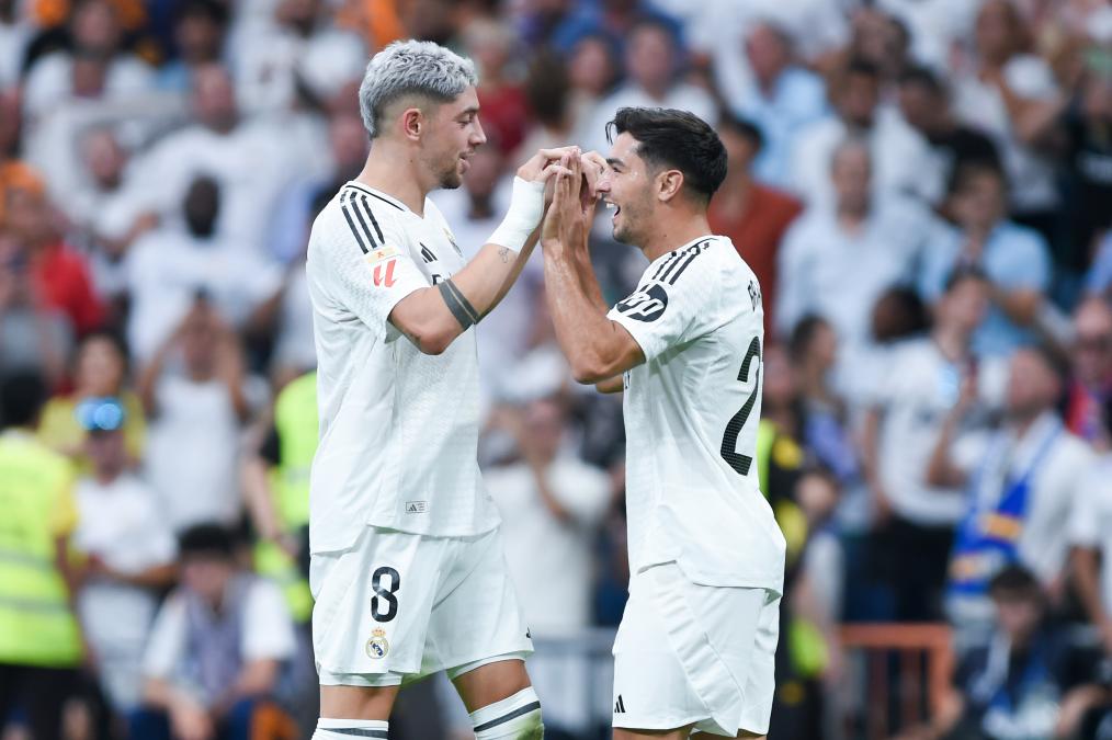 8月25日,皇家馬德里隊球員巴爾韋德(左)與隊友迪亞斯在比賽中慶祝進球。新華社發(fā)(古斯塔沃·巴連特攝)