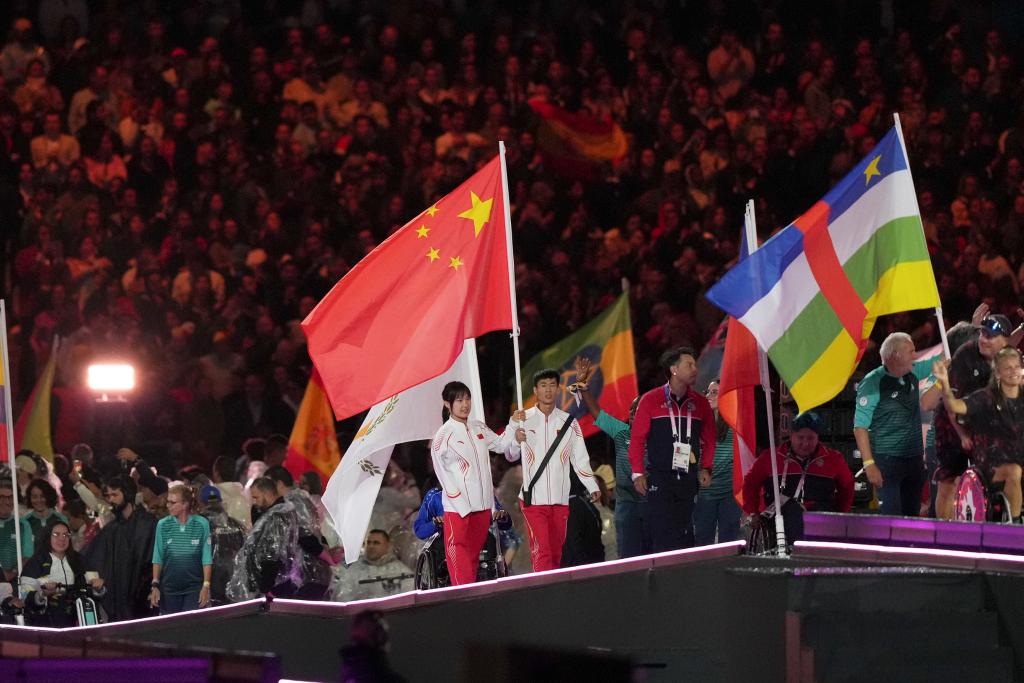 9月8日,巴黎殘奧會(huì)中國(guó)體育代表團(tuán)旗手女子游泳運(yùn)動(dòng)員蔣裕燕(中左)和男子田徑運(yùn)動(dòng)員邸東東(中右)在閉幕式上入場(chǎng)。新華社記者 黃偉 攝