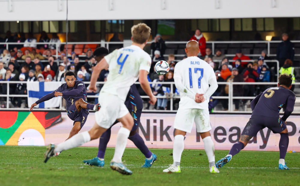 10月13日,英格蘭隊球員阿諾德(左一)主罰任意球破門。