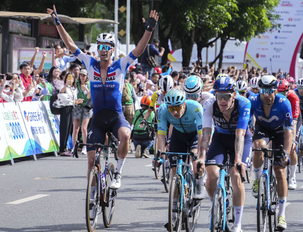 10月16日,速的奧快步車隊的比利時車手瓦爾·范格魯威(左一)在沖線后慶祝。新華社記者 金皓原 攝
