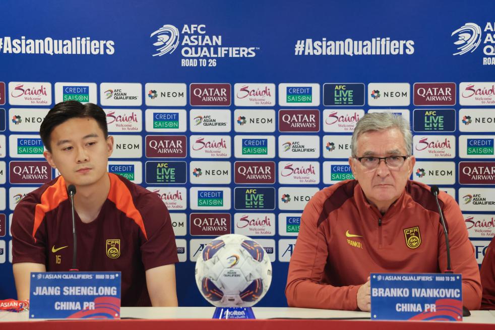 11月13日,中國(guó)國(guó)家男子足球隊(duì)主教練伊萬(wàn)科維奇(右)和球員蔣圣龍?jiān)谫惽靶侣劙l(fā)布會(huì)上。新華社記者 王海洲 攝