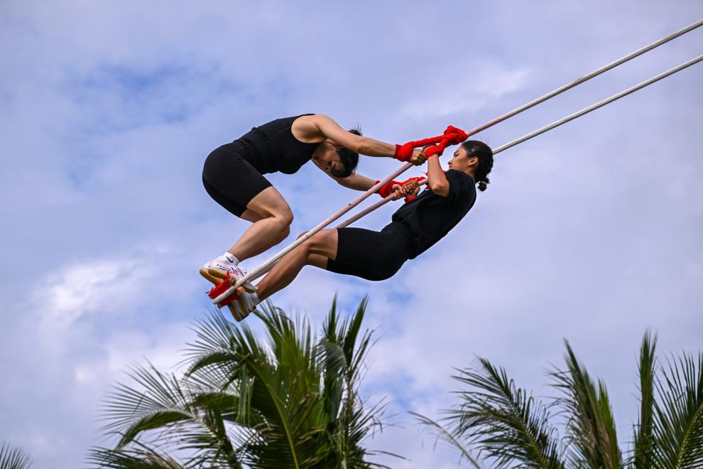 洪吐斯汗·杜開,這位“河貍”選手在上一屆運(yùn)動(dòng)會(huì)獲得過二等獎(jiǎng)。這次來到三亞,她和新伙伴有著20歲左右的年齡差距,但依然合作默契。對(duì)古麗阿亞提而言,洪吐斯汗既是一位好隊(duì)友,又是一位大姐姐,有時(shí)還像一位“教練”。比賽的時(shí)候,洪吐斯汗在完成規(guī)律的發(fā)力動(dòng)作、保持呼吸節(jié)奏的同時(shí),還會(huì)安撫搭檔的情緒,提醒搭檔調(diào)整體態(tài),力求得分。