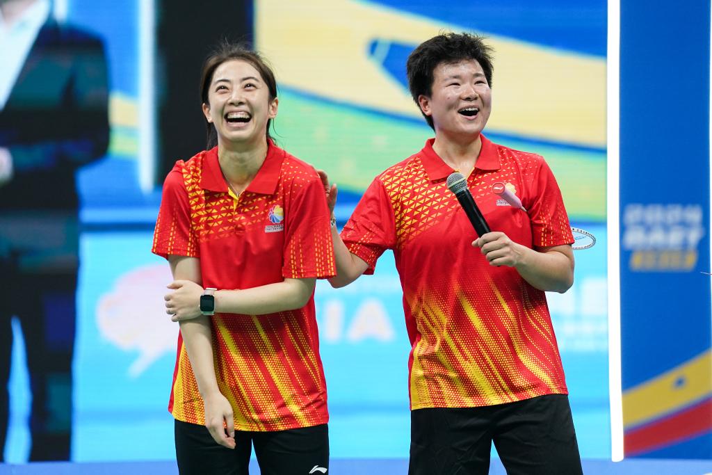 12月15日,王適嫻(左)、何冰嬌在賽后接受采訪。新華社記者 杜宇 攝