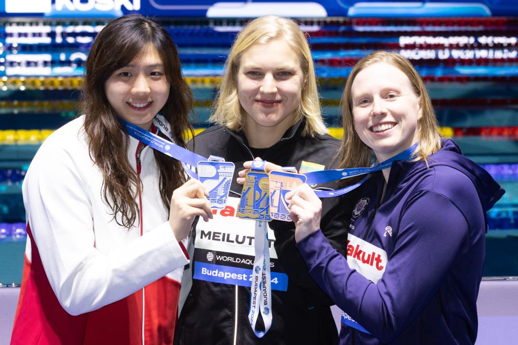12月15日,冠軍立陶宛選手美露泰(中)、亞軍中國選手唐錢婷(左)和季軍美國選手莉莉·金在頒獎儀式上。當(dāng)日,在短池世錦賽女子50米蛙泳決賽中,唐錢婷獲得亞軍。新華社發(fā)(弗爾季·奧蒂洛 攝)