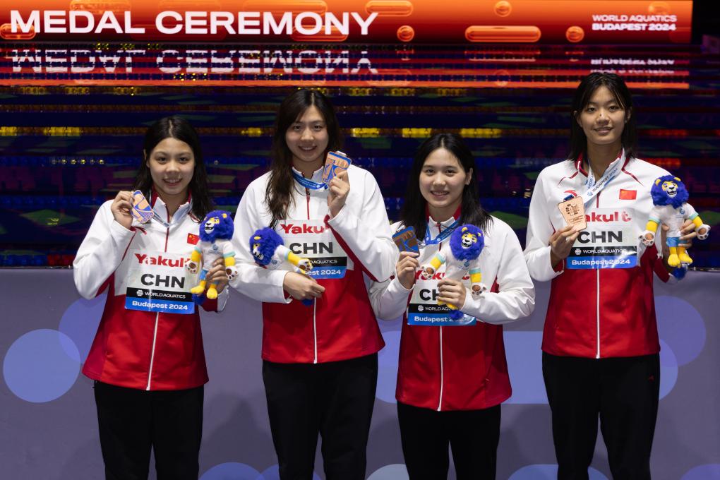 12月15日,季軍中國隊選手錢心安、唐錢婷、陳露穎、劉姝含(由左至右)在頒獎儀式上。當(dāng)日,在短池世錦賽女子4x100米混合泳接力決賽中,中國隊獲得季軍。新華社發(fā)(弗爾季·奧蒂洛 攝)