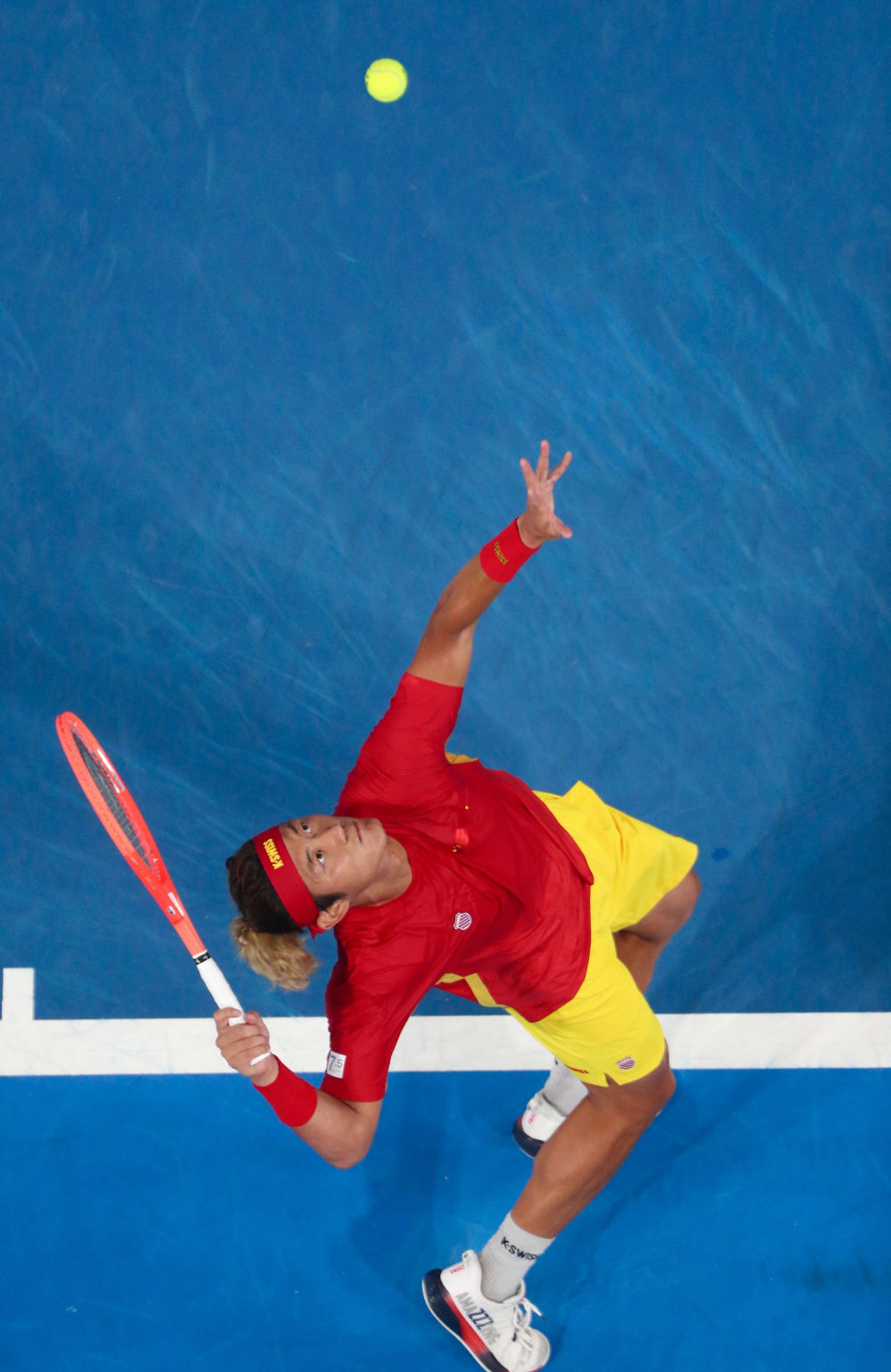 1月1日,中國(guó)隊(duì)選手張之臻在男單比賽中發(fā)球。新華社發(fā)(周丹攝)