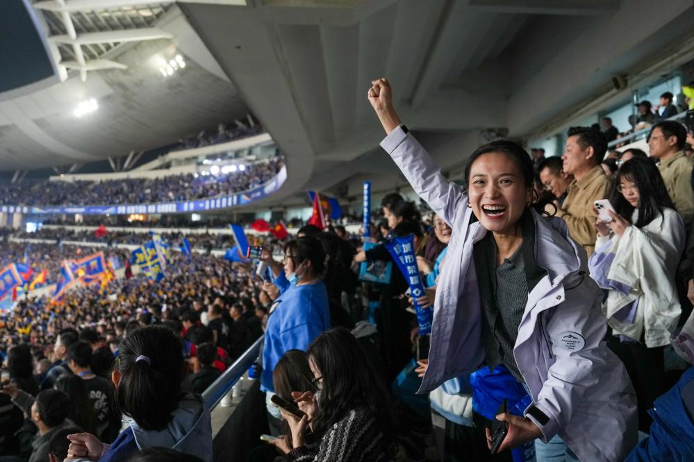 11月1日,一名球迷在看臺為雙方球隊(duì)加油。新華社記者 李博 攝