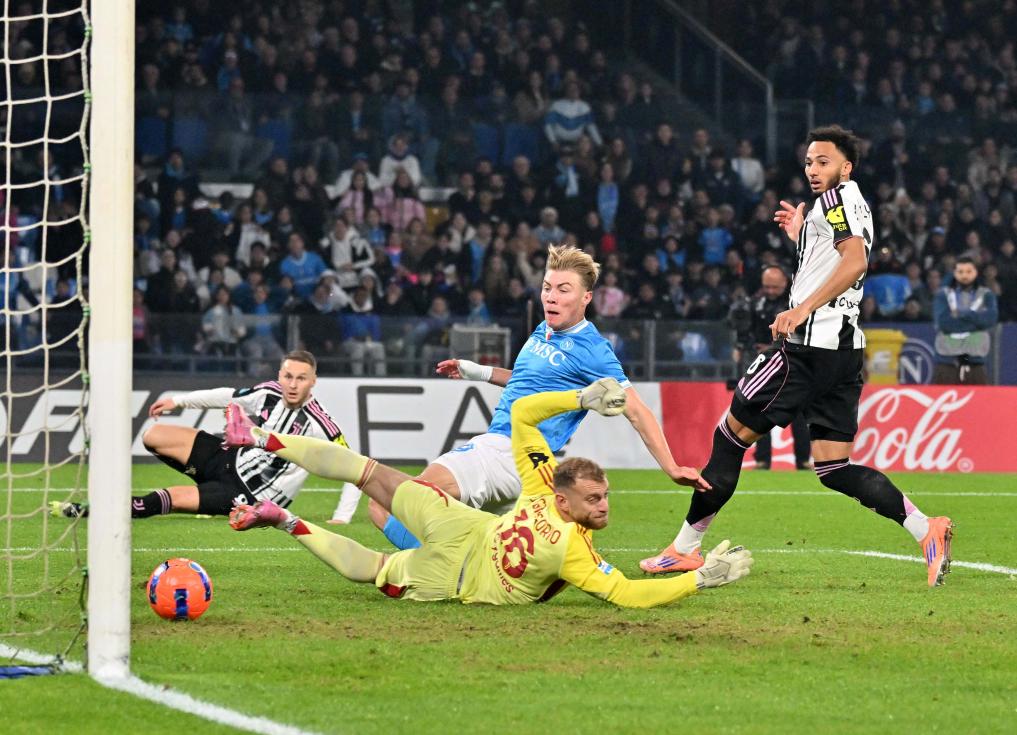 那不勒斯開場不久就有所斬獲。第七分鐘,霍伊倫接隊友內雷斯的橫傳,近距離包抄破門。此后兩隊你來我往,上半時接近尾聲時,尤文球員凱利將絕佳機會球踢飛,而主隊麥克托米納的頭球也被立柱拒絕。