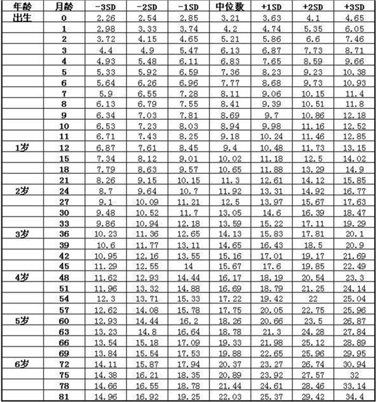 表1嬰幼兒童體重對(duì)照表(男)