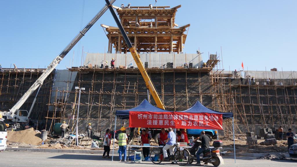 為深入貫徹落實(shí)習(xí)近平新時(shí)代中國(guó)特色社會(huì)主義思想和黨的十九大及十九屆二中、三中、四中全會(huì)精神,貫徹落實(shí)《保障農(nóng)民工工資支付條例》和國(guó)家、山西省關(guān)于農(nóng)民工服務(wù)工作的部署,切實(shí)加強(qiáng)我市農(nóng)民工安全生產(chǎn)意識(shí),提高農(nóng)民工的維權(quán)意識(shí)和維權(quán)能力,8月13日下午,忻州市司法局組織市法律援助中心、公證處、律師事務(wù)所、司法鑒定中心組成法律援助志愿服務(wù)隊(duì),走進(jìn)忻州古城建筑工地現(xiàn)場(chǎng),開展了“法援惠民生·助力農(nóng)民工”法律援助志愿服務(wù)活動(dòng)。