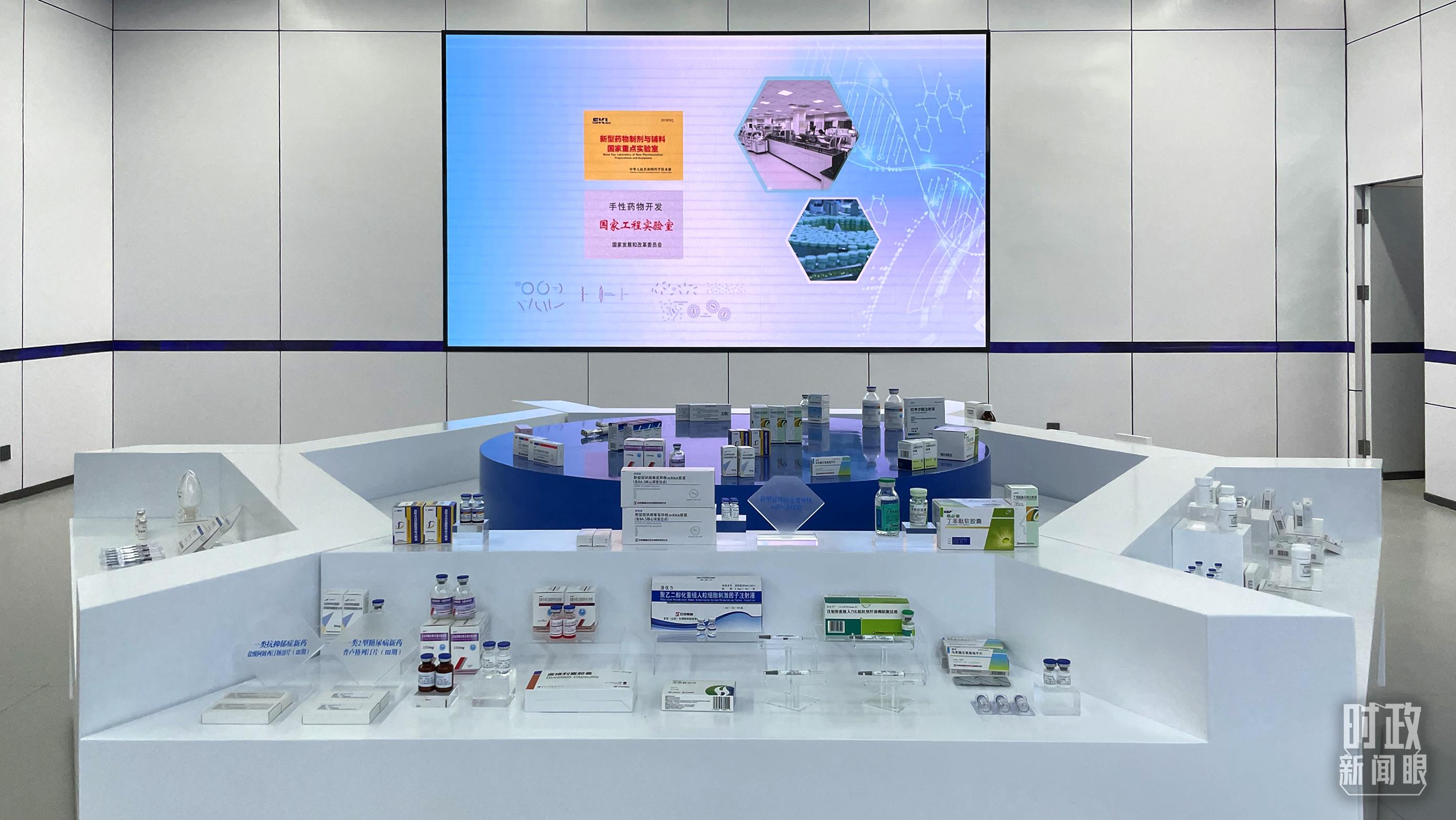 △石家莊國(guó)際生物醫(yī)藥園規(guī)劃展館內(nèi)展示企業(yè)研發(fā)生產(chǎn)的藥品。(總臺(tái)央視記者蔣碩拍攝)
