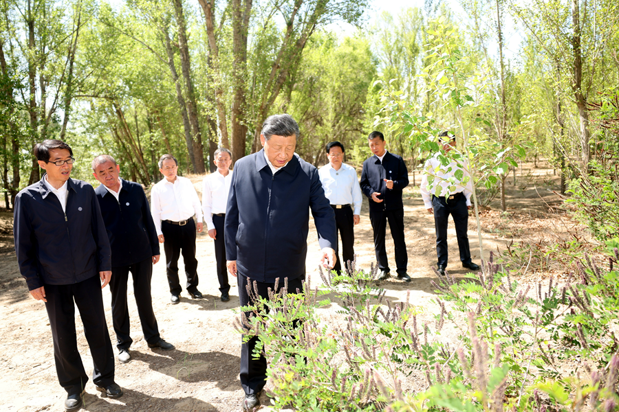 2023年6月5日至6日,中共中央總書記、國家主席、中央軍委主席習近平在內蒙古巴彥淖爾考察,并主持召開加強荒漠化綜合防治和推進“三北”等重點生態(tài)工程建設座談會。這是5日下午,習近平在烏梁素??疾?。新華社記者 謝環(huán)馳 攝