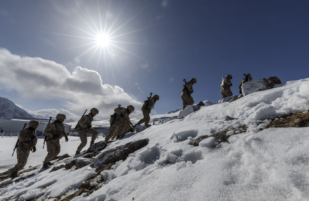 位于帕米爾高原的新疆軍區(qū)某邊防團紅其拉甫邊防連的戰(zhàn)士在巡邏(2023年4月13日攝)。新華社記者 費茂華 攝