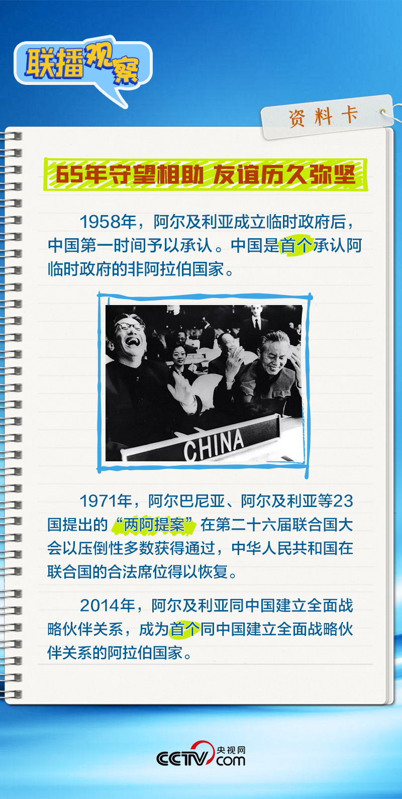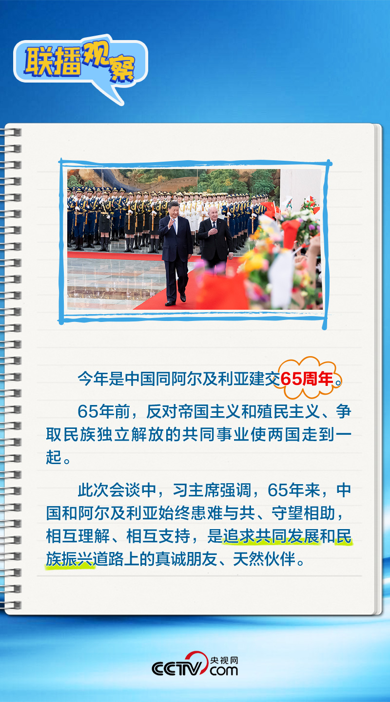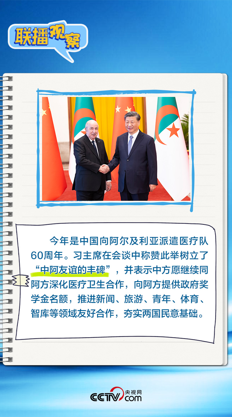 會(huì)談中,習(xí)主席特別提到,今年是中國(guó)向阿爾及利亞派遣醫(yī)療隊(duì)60周年,并稱贊此舉樹(shù)立了“中阿友誼的豐碑”。中阿傳統(tǒng)友誼深厚,兩國(guó)始終相互尊重、平等相待、彼此支持,締造了一段段友好交往的佳話。