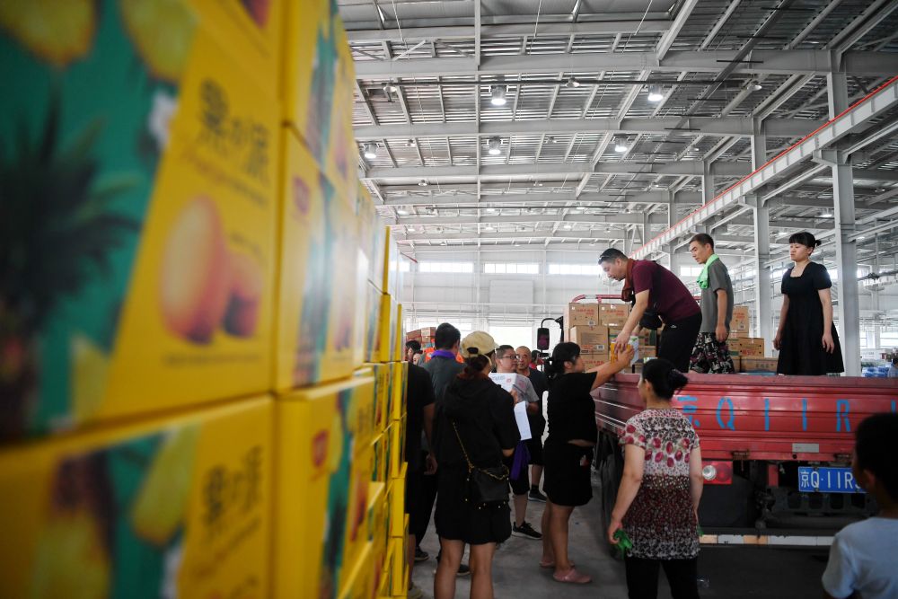 工作人員和志愿者在河北省涿州市鋼研物資儲備點(diǎn)內(nèi)將捐贈物資裝車外運(yùn)(8月5日攝)。新華社記者 牟宇 攝