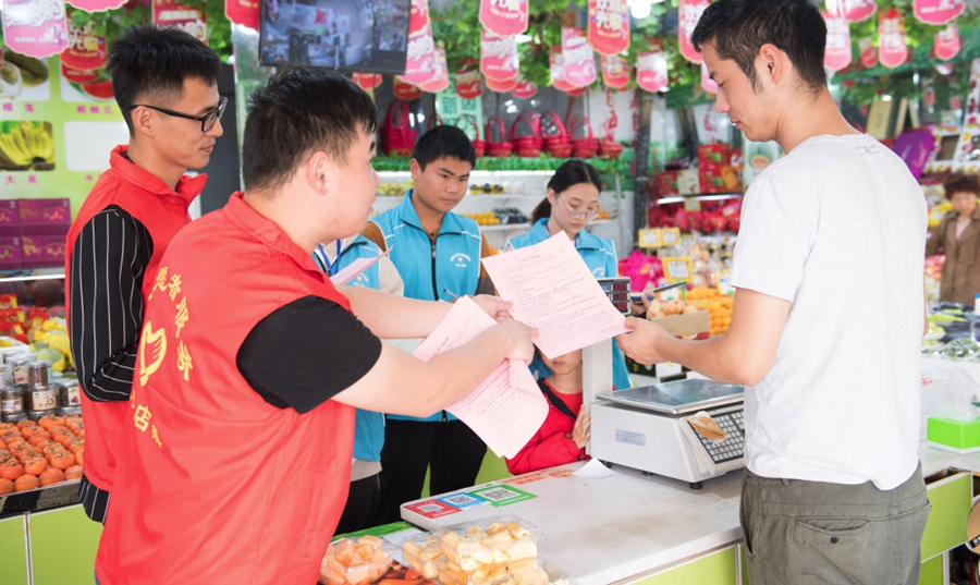 浙江省湖州市吳興區(qū)八里店鎮(zhèn)結(jié)合主題教育和“三服務(wù)”,推進“民生大走訪”工作機制,全體網(wǎng)格員下沉村、社一線,了解社情民意,化解矛盾糾紛,服務(wù)村社群眾。這是八里店鎮(zhèn)中心片區(qū)網(wǎng)格員(藍衣者)和志愿者(紅衣者)對一家店鋪進行平安問卷調(diào)查(2019年10月31日攝)。新華社記者 翁忻旸 攝