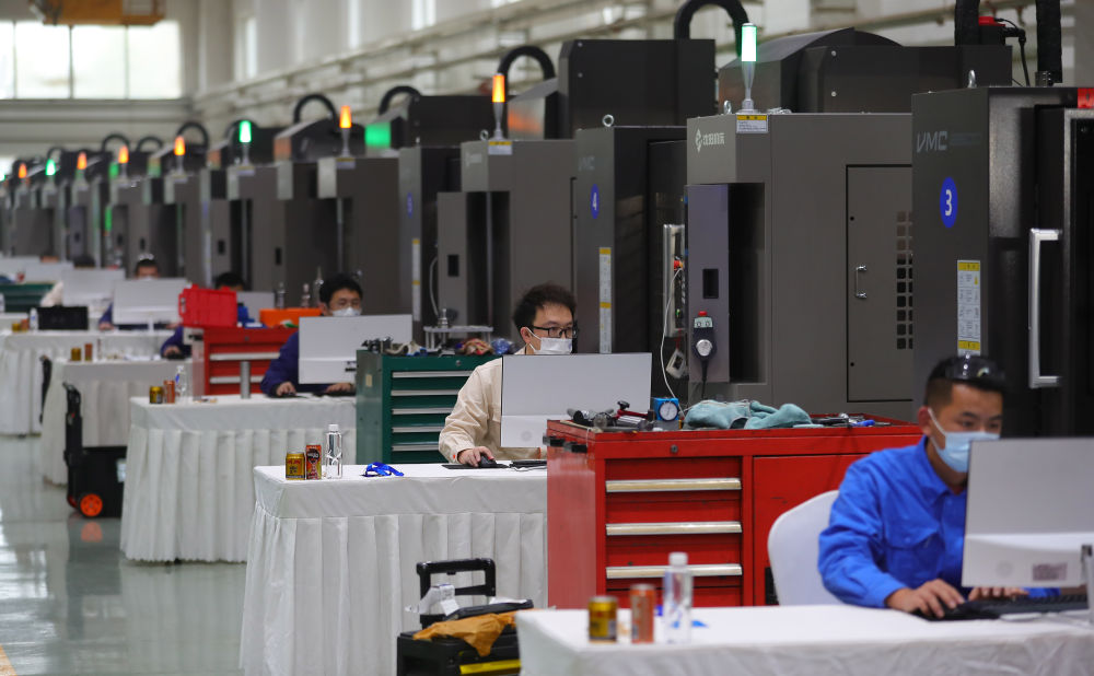 參賽選手在在2022“一帶一路”暨金磚國家技能發(fā)展與技術創(chuàng)新之“通用技術杯”數(shù)控多軸加工大賽中比拼(2022年11月10日攝)。新華社記者 楊青 攝