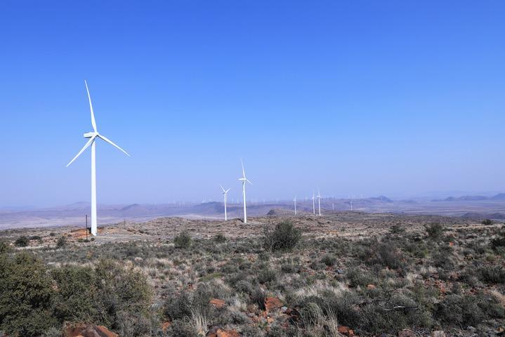 這是8月10日在南非北開普省德阿鎮(zhèn)拍攝的中國國家能源集團龍源電力南非公司運營的德阿風電項目風機。新華社記者 董江輝 攝