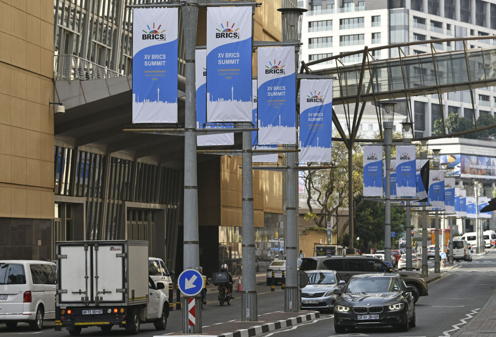 這是8月17日在南非約翰內(nèi)斯堡拍攝的金磚峰會條幅。金磚國家領導人第十五次會晤將于南非約翰內(nèi)斯堡舉行。新華社記者 陳誠 攝