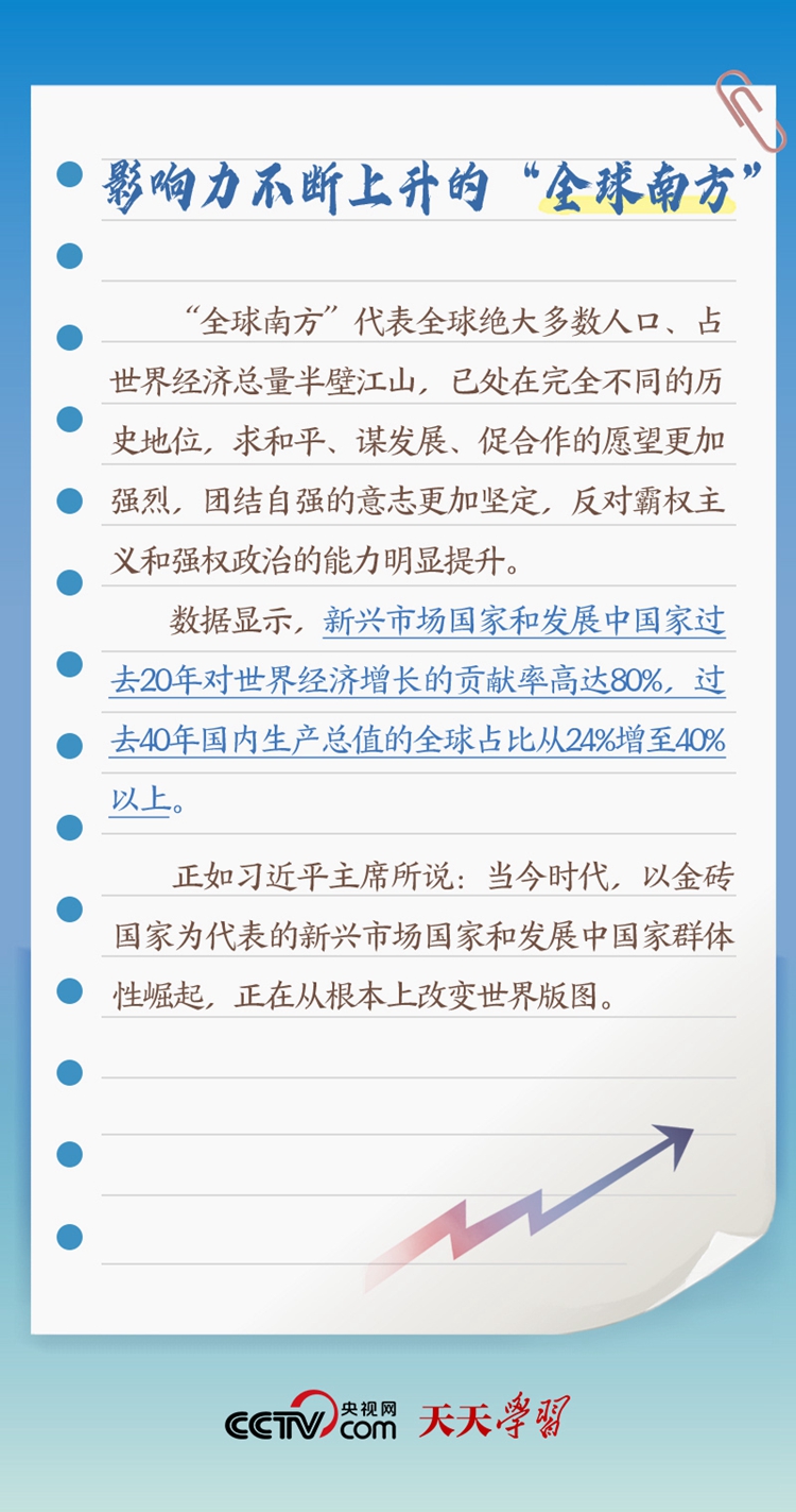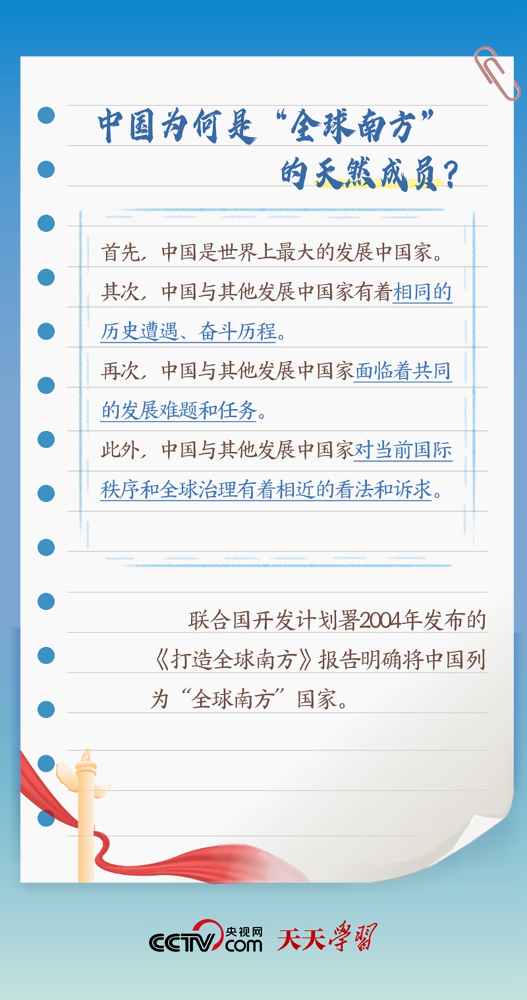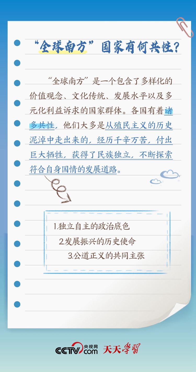 天天學(xué)習(xí)“作為發(fā)展中國(guó)家、‘全球南方’的一員,中國(guó)始終同其他發(fā)展中國(guó)家同呼吸、共命運(yùn)”;“中南作為‘全球南方’天然成員,更要團(tuán)結(jié)一致,共同呼吁擴(kuò)大發(fā)展中國(guó)家在國(guó)際事務(wù)中的話(huà)語(yǔ)權(quán)和影響力”;“提升‘全球南方’國(guó)家在全球治理中的代表性和發(fā)言權(quán)”。 此次出訪,習(xí)近平主席在向約翰內(nèi)斯堡金磚國(guó)家工商論壇閉幕式發(fā)表致辭、同南非總統(tǒng)拉馬福薩共同會(huì)見(jiàn)記者等場(chǎng)合均提及“全球南方”。什么是“全球南方”?“全球南方”國(guó)家有何共性?中國(guó)為何是“全球南方”的天然成員?跟著央視網(wǎng)《天天學(xué)習(xí)》一起了解。