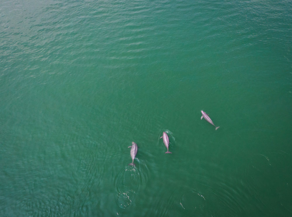 這是2021年5月11日在湖北省宜昌市拍攝的在水中嬉戲的長(zhǎng)江江豚(無人機(jī)照片)。新華社記者 肖藝九 攝