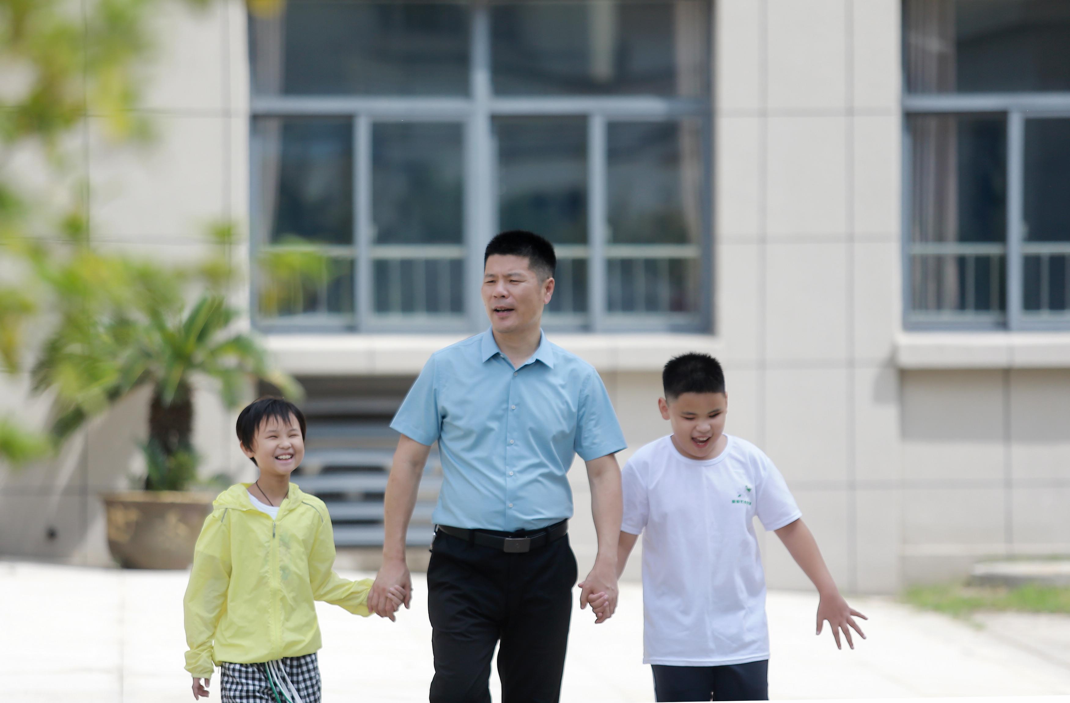△2023年9月7日,江蘇省揚州市特殊教育學(xué)校的孩子們和老師一起在校園里散步。